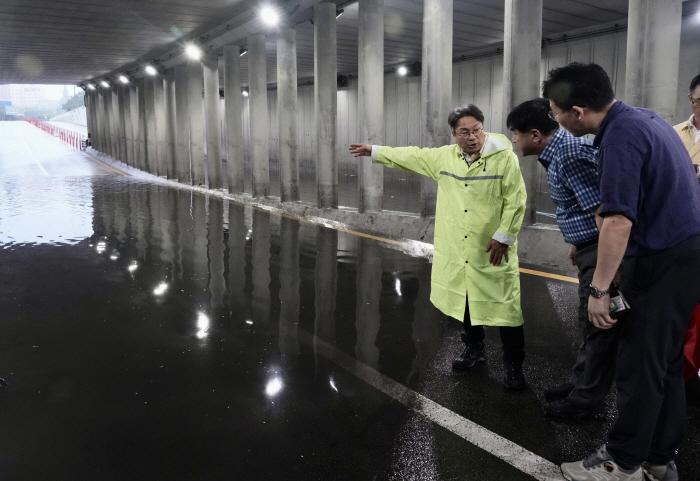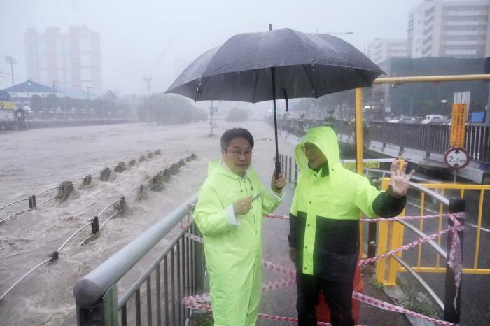 [ÄÚ¸®¾Æ¹®È½ºÆ÷Ã÷Àú³Î] °±âÁ¤ ±¤ÁÖ±¤¿ª½ÃÀåÀÌ È£¿ì °æº¸°¡ ¹ßÈ¿µÈ 17ÀÏ ¿ÀÈÄ ¼±¸ ¾çµ¿º¹°³»ó°¡ ¾Õ ÅÂÆò±³¿¡¼ ±¤ÁÖõ ¼öÀ§ ÇöȲ µî ÀçÇØ¿ì·ÁÁö¿ªÀ» ÇöÀåÁ¡°ËÇϰí, Æø¿ì¿¡ Àá±ä ³ó¼ºÁöÇÏÂ÷µµ¸¦ »ìÆìº¸°í ÀÖ´Ù.
