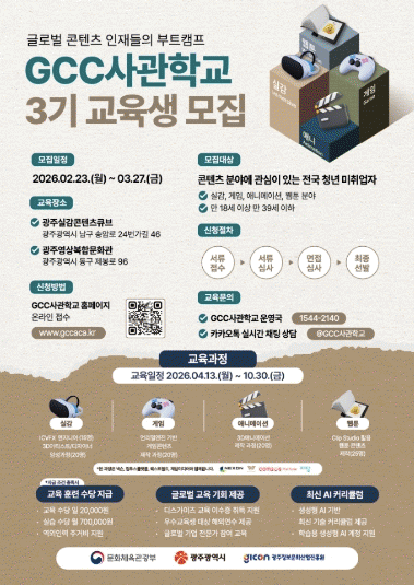 ±¤ÁÖ±¤¿ª½Ã´Â ¹®ÈÄÜÅÙÃ÷ »ê¾÷À» ¼±µµÇÒ Àü¹®Àη ¾ç¼ºÀ» À§ÇØ ¡®GCC»ç°üÇб³¡¯ 3±â ±³À°»ý 100¸íÀ» ¿À´Â 3¿ù27ÀϱîÁö ¸ðÁýÇÑ´Ù.