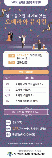 ºÎ»ê±¤¿ª½Ã¸³Áß¾Óµµ¼°ü(°üÀå Çѵ¿ÀÎ)Àº ¿À´Â 4¿ù 11ÀϺÎÅÍ 5¿ù 2ÀϱîÁö ¸ÅÁÖ Åä¿äÀÏ ¿ÀÀü 10½Ã ¿Â¶óÀÎ(ZOOM)À» ÅëÇØ µµ¼°ü Àι®ÇÐ ¾ÆÄ«µ¥¹Ì ÇÁ·Î±×·¥ ¡®¾Ë°í µéÀ¸¸é ´õ Àç¹ÌÀÖ´Â ¿ÀÆä¶ó¿Í ¹ÂÁöÄá¯À» ¿î¿µÇÑ´Ù.