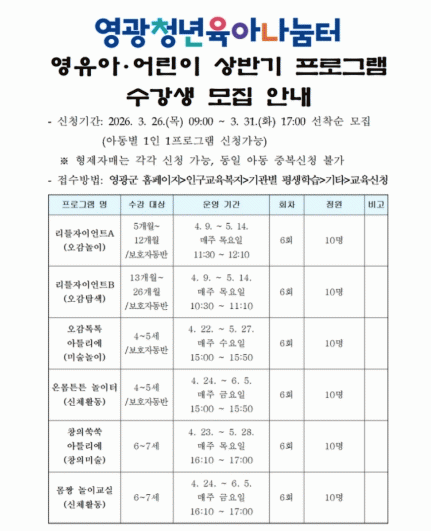 ¿µ±¤±ºÀº ¡®¿µ±¤Ã»³âÀ°¾Æ³ª´®ÅÍ¡¯¿¡¼ ¿µÀ¯¾Æ?¾î¸°À̸¦ ´ë»óÀ¸·Î ÇÏ´Â ¡¸2026³â »ó¹Ý±â ÇÁ·Î±×·¥¡¹ ¼ö°»ýÀ» ¸ðÁýÇÑ´Ù°í ¹àÇû´Ù.