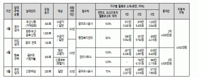 5¿ù¿¡´Â ¡®±¹¹ÎÀÓ´ëÁÖÅᯠ½ÅûÀÌ ±¤ÁÖµµ½Ã°ø»ç¸¦ ÅëÇØ ÁøÇàµÈ´Ù. ¿ùÆò±Õ¼Òµæ 70% ÀÌÇÏ ¼¼´ë°¡ ´ë»óÀ̸ç, ½ÅâÁö±¸ 66Çü(20ÆòÇü)°ú Çϳ²Áö±¸ 79Çü(24ÆòÇü) µî¿¡¼ ¿ä°Ç ÃæÁ· ½Ã ÃÖÀå 30³â °ÅÁÖ°¡ °¡´ÉÇÏ´Ù.