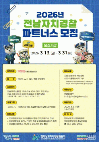 Àü¶ó³²µµÀÚÄ¡°æÂûÀ§¿øÈ¸´Â µµ¹Î°úÀÇ ¼ÒÅëÀ» °ÈÇϰí ÇöÀå Á᫐ ÀÚÄ¡°æÂû Ä¡¾È Ȱµ¿À» ÇÔ²²ÇÒ ¡®2026³â Àü³²ÀÚÄ¡°æÂû ÆÄÆ®³Ê½º¡¯¸¦ 31ÀϱîÁö ¸ðÁýÇÑ´Ù°í ¹àÇû´Ù.
