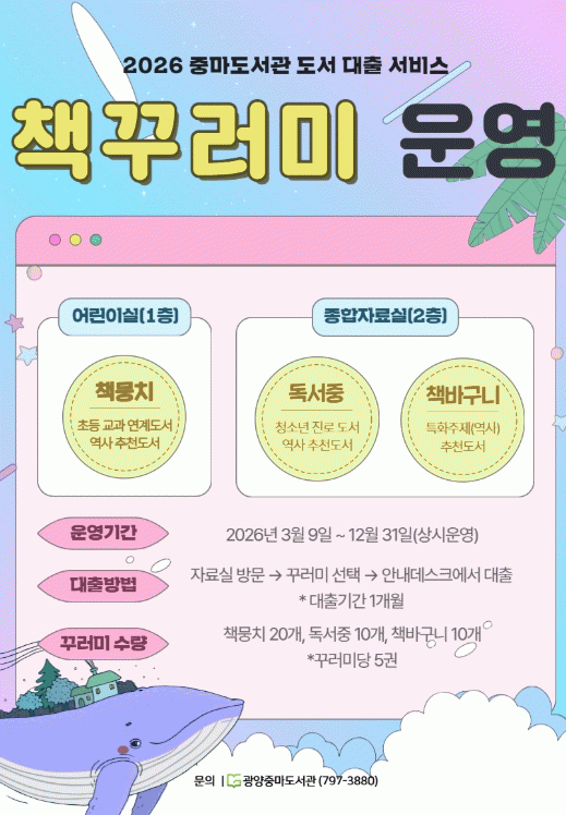 ±¤¾çÁ߸¶µµ¼°üÀº ½Ã¹ÎµéÀÇ µ¶¼È°µ¿À» Áö¿øÇϰí Áö¿ª»çȸ¿¡ Ã¥ Àд ¹®È¸¦ È®»êÇϱâ À§ÇØ Áö³ÇØ¿¡ ÀÌ¾î ¡®¸ÂÃãÇü Ã¥ ²Ù·¯¹Ì¡¯ ¼ºñ½º¸¦ ¿î¿µÇÑ´Ù.