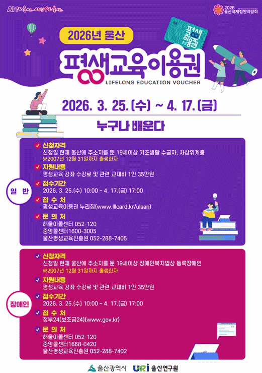 ¿ï»ê½Ã´Â ½Ã¹Î ´©±¸³ª Æò»ýÇнÀÀÇ ±âȸ¸¦ ´©¸± ¼ö ÀÖµµ·Ï ¡®2026³â ¿ï»ê±¤¿ª½Ã Æò»ý±³À°ÀÌ¿ë±Ç(ÀÌÇÏ ÀÌ¿ë±Ç) Áö¿ø»ç¾÷¡¯À» º»°Ý ÃßÁøÇÑ´Ù°í ¹àÇû´Ù.