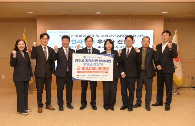 ½ÅÇѶóÀÌÇÁ°¡ ¡°1Àΰ¡±¸ µ¹º½°ú ¼Ò»ó°øÀÎ Áö¿ø »ç¾÷¿¡ »ç¿ëÇØ´Þ¶ó¡±¸ç ±¤Áֽÿ¡ ÈÄ¿ø±Ý 1¾ï¿øÀ» Àü´ÞÇß´Ù.