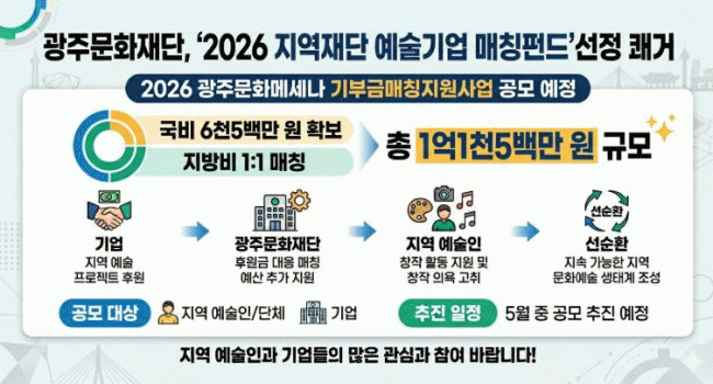 ±¤ÁÖ¹®ÈÀç´ÜÀº Çѱ¹¹®È¿¹¼úÀ§¿øÈ¸°¡ ÁÖ°üÇÏ´Â ¡®2026³â Áö¿ªÀç´Ü ¿¹¼ú±â¾÷ ¸ÅĪÆÝµå Áö¿ø»ç¾÷¡¯ °ø¸ð¿¡ ÃÖÁ¾ ¼±Á¤µÅ ±¹ºñ 6õ5¹é¸¸ ¿øÀ» È®º¸Çß´Ù°í ¹àÇû´Ù.