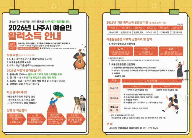 Àü³² ³ªÁֽð¡ Áö¼Ó °¡´ÉÇÑ ¹®È¿¹¼ú »ýŰè Á¶¼ºÀ» À§ÇØ ¡®2026³â 2ºÐ±â ¿¹¼úÀΠȰ·Â¼Òµæ Áö¿ø±Ý¡¯ ½ÅûÀ» ¿À´Â 5¿ù 19ÀϱîÁö Á¢¼öÇÑ´Ù.