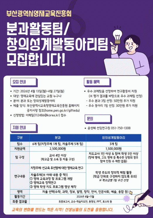 ºÎ»ê±¤¿ª½Ã±³À°Ã»¿µÀç±³À°ÁøÈï¿øÀº ¿À´Â 27ÀϱîÁö ¿µÀç±³À°¿¡ °ü½É ÀÖ´Â ±³¿øÀ» ´ë»óÀ¸·Î ¡®2026³âµµ ¿µÀç±³À°ÁøÈïȸ ¿¬±¸°úÁ¦ ÆÀ¡¯À» °ø°³ ¸ðÁýÇÑ´Ù.