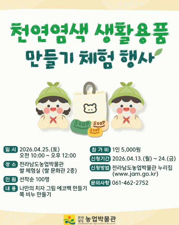 Àü¶ó³²µµ³ó¾÷¹Ú¹°°üÀÌ ¿À´Â 25ÀÏ ¿ÀÀü 10½ÃºÎÅÍ ½Ò ¹®È°ü 2Ãþ üÇè½Ç¿¡¼ °¡Á· ´ÜÀ§ µµ¹ÎÀ» ´ë»óÀ¸·Î ¡®Ãµ¿¬¿°»ö »ýȰ¿ëǰ ¸¸µé±â üÇèÇà»ç¡¯¸¦ °³ÃÖÇÑ´Ù.