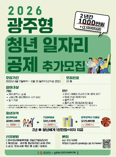 ±¤ÁÖ±¤¿ª½Ã´Â Áö¿ª û³âÀÇ ÀÚ»ê Çü¼º°ú Àå±â±Ù¼ÓÀ» Áö¿øÇϱâ À§ÇÑ ¡®±¤ÁÖÇü û³â ÀÏÀÚ¸® °øÁ¦»ç¾÷¡¯ Âü¿©ÀÚ 30¸íÀ» 4¿ù17ÀϺÎÅÍ 6¿ù30ÀϱîÁö Ãß°¡ ¸ðÁýÇÑ´Ù.