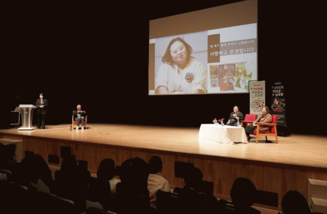 ¼ÀºÇý ÀÛ°¡¿Í °¡Á·µéÀÌ 17ÀÏ ¿ï»êÇлý±³À°¹®Èȸ°ü ´ë°ø¿¬Àå¿¡¼ ÀÚ½ÅÀÇ »î°ú ÀÛǰ¿¡ ´ëÇØ Ư¼öÇÐ±Þ Çлýµé°ú °øÀ¯Çϰí ÀÖ´Ù