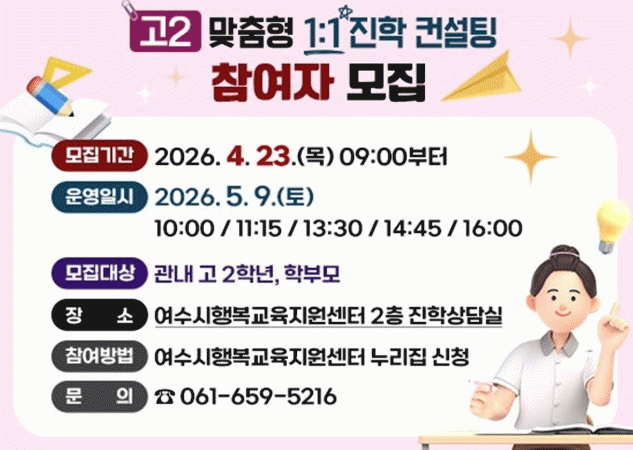 ¿©¼ö½Ã´Â °ü³» °í2 Çлý°ú Çкθ𸦠À§ÇØ ¿À´Â 5¿ù 9ÀÏ Åä¿äÀÏ ¿©¼ö½ÃÇູ±³À°Áö¿ø¼¾ÅÍ¿¡¼ ¡®°í2 ¸ÂÃãÇü 1:1 ÁøÇÐ ÄÁ¼³ÆÃ¡¯À» ¿î¿µÇÑ´Ù°í ¹àÇû´Ù.