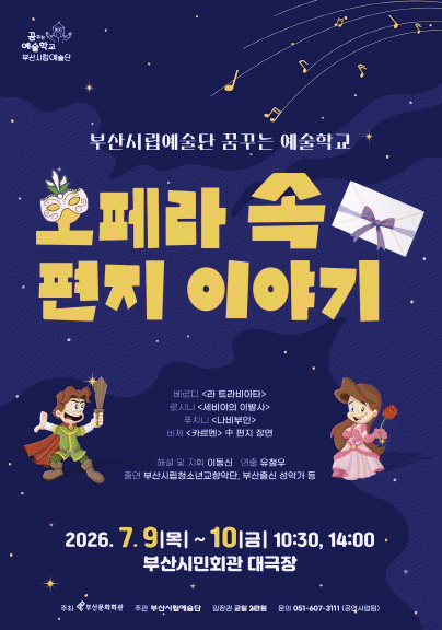 ºÎ»ê½Ã¸³¿¹¼ú´Ü¿¡¼´Â Ưº°±âȹ ¡®¿ÀÆä¶ó ¼Ó ÆíÁö À̾߱⡯¿¡ Ã⿬ÇÒ ¼Ö¸®½ºÆ®µéÀ» ¸ðÁýÇÑ´Ù. À̹ø ¿ÀÆä¶ó ¹«´ë¸¦ ÅëÇØ ÀڽŸ¸ÀÇ ½Ç·Â°ú ³¢¸¦ ¹æÃâÇÒ ºÎ»êÁö¿ªÀÇ Ã»³â ¿¹¼úÀεéÀ» ¼±¹ßÇÒ ¿¹Á¤ÀÌ´Ù.