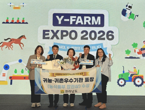 Àü¶ó³²µµ´Â 24ÀÏ ¼ö¿øÄÁº¥¼Ç¼¾ÅÍ¿¡¼ ¿¸° ¡®2026 ¿ÍÀÌÆÊ ¿¢½ºÆ÷(Y-FARM EXPO)¡¯¿¡¼ ³ó¸²Ãà»ê½ÄǰºÎÀÇ ³ó¾÷ÀηÂÀ°¼º½ÃÃ¥ ÃßÁø À¯°øÀÚ Ç¥Ã¢¿¡¼ ±Í³ó¾î±ÍÃÌ ¿ì¼ö½ÃÃ¥ ÃßÁø±â°üÀ¸·Î ¼±Á¤µÅ Àå°ü»óÀ» ¹Þ¾Ò´Ù.